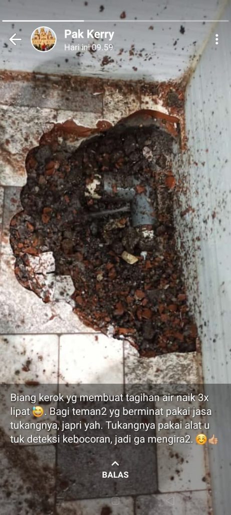 Alhamdulillah dengan alat khusus dan keahlian kami, akhirnya kami dapat menemukan letak kebocoran saluran pipa.